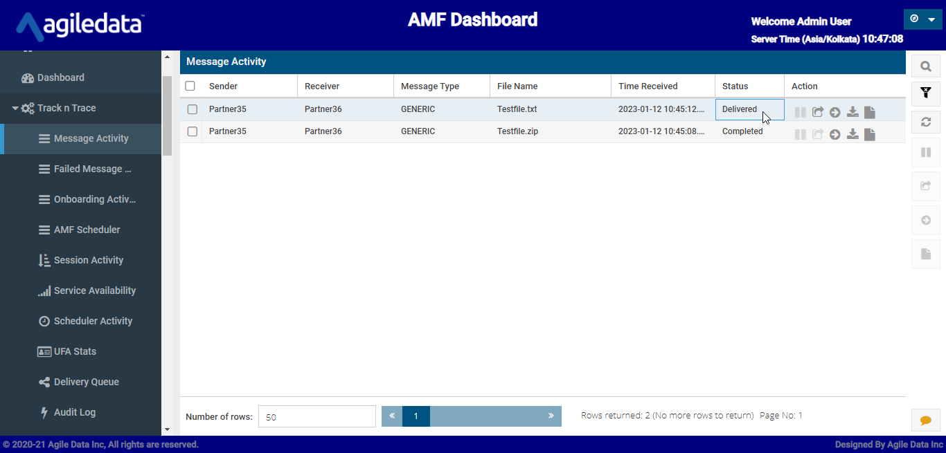 L. Verify the Message Activity in AMF once the Partner35 uploads the file to SFG via Share point protocol. If everything was configured correctly, the file will be delivered to Partner36 via S3 protocol using AMF.