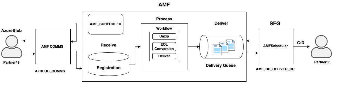 **Use Case:**  We run Schedule to get file from Partner49 (Sender) folder to SFG via Azure blob Protocol, we use Actions Unzip, EOL Conversion and Deliver those files to the Partner50 (Receiver) using CD Protocol via AMF.&#x20;