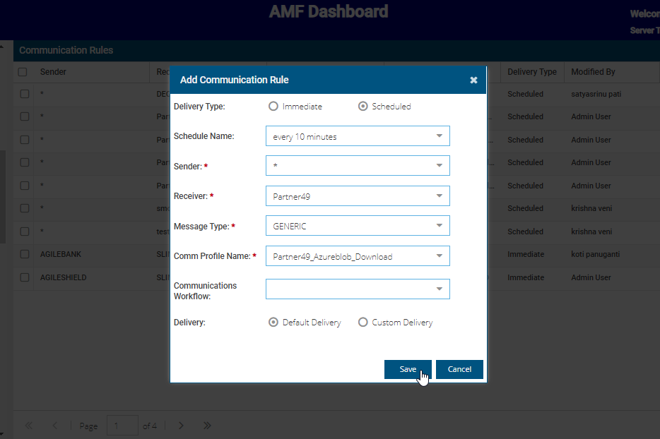 **C. Create Communication Rule with Sender, Receiver, Message Type and Comm Profile Name. Select Delivery Type as Schedule.**