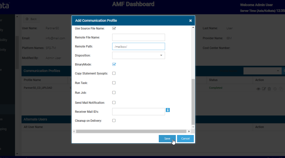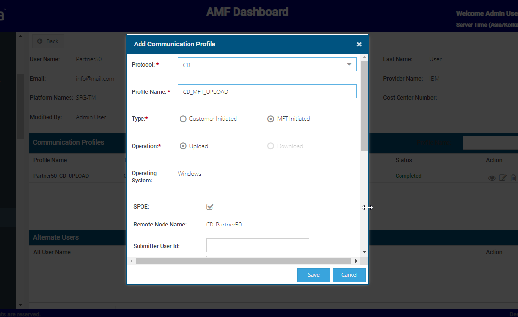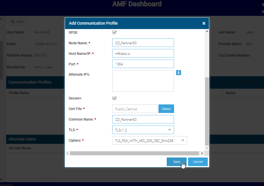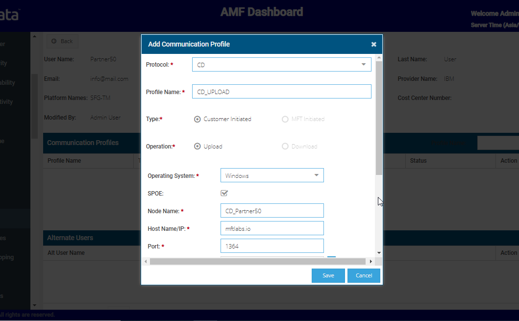 L. Onboard Partner50 Connect Direct node Profile in SFG using AMF (MFT Initiated Communication Profile (Outbound))