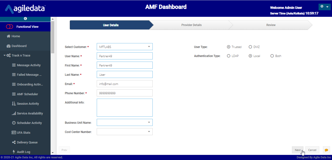 Select Customer and give details of Partner49, select User Type, Authentication Type and click next.