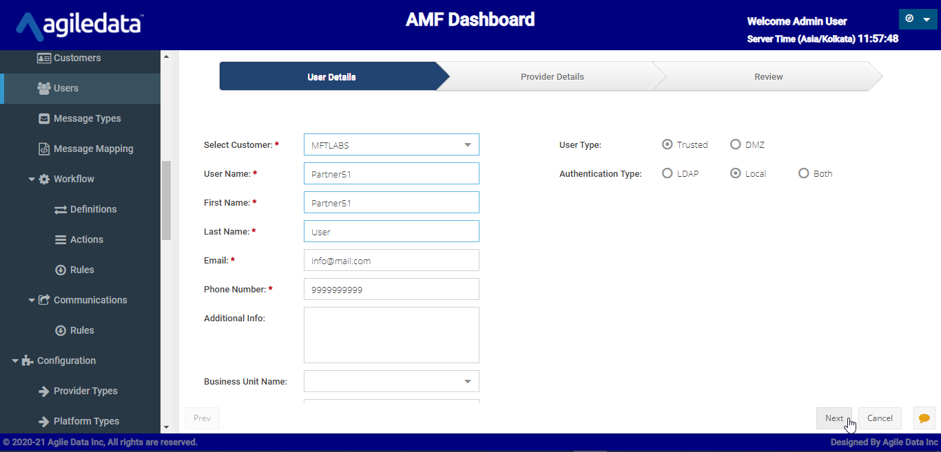 Select Customer and give details of Partner51, select User Type, Authentication Type and click next.